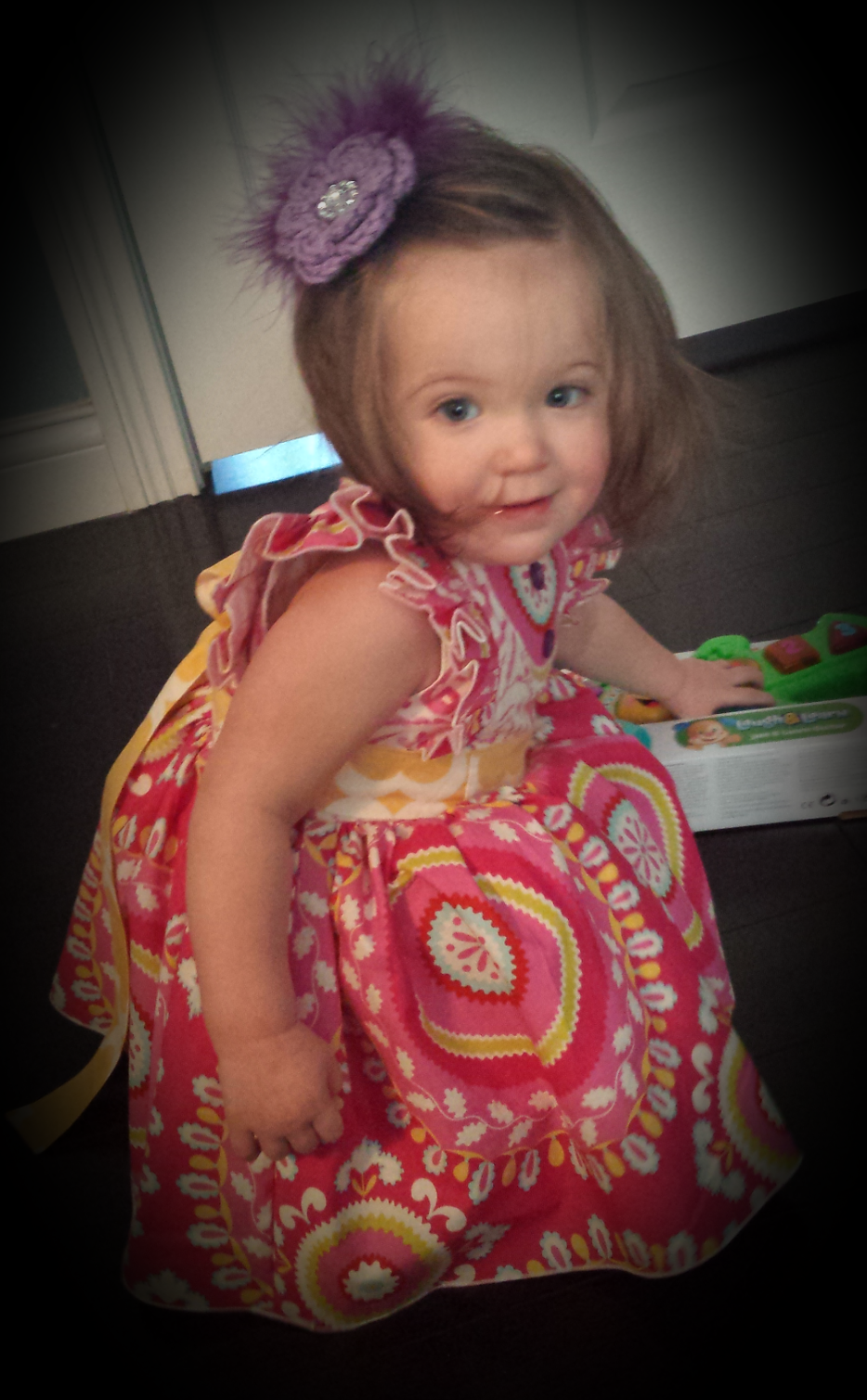 Ah, and here she is in all her glory. My little girl showing off her new dress! Her favorite thing by the way...twirling! She loves that when she spins around the room, the dress flares out. Who can blame her!? It was my favorite thing when I was little too. Oh, that and my picture taking (clapping) shoes! :-)